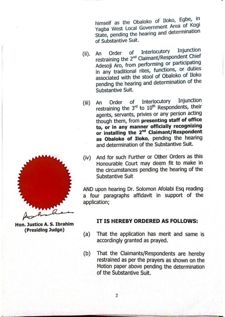 - Mr. Adesoji Aro is restrained from parading himself, performing any rites, or acting in any capacity as the Obaloko of Iloko.