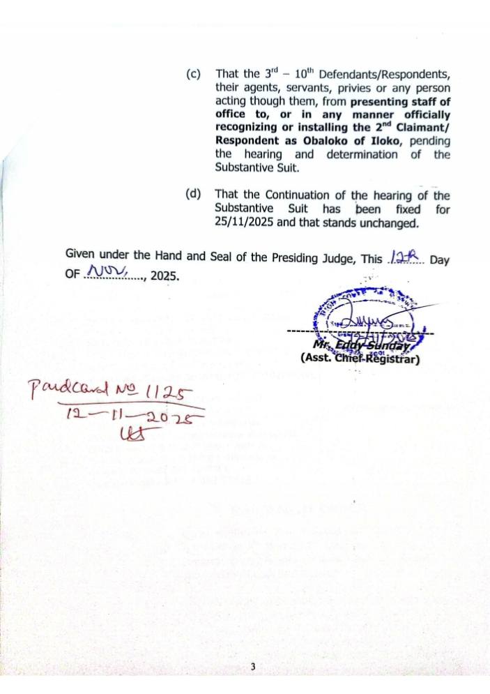 - The 3rd–10th Respondents, including traditional and governmental authorities, are similarly restrained from recognising him, issuing a staff of office, or installing him in the role.