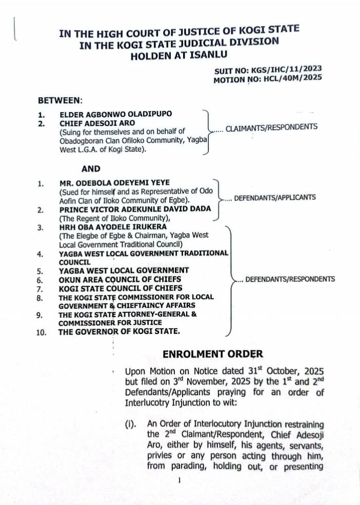 The High Court of Justice, Kogi State (Isanlu Division), has delivered a decisive ruling on the contested Iloko chieftaincy matter, issuing an Interlocutory Injunction that reinforces the legitimacy of the recognized Obaloko-Elect.